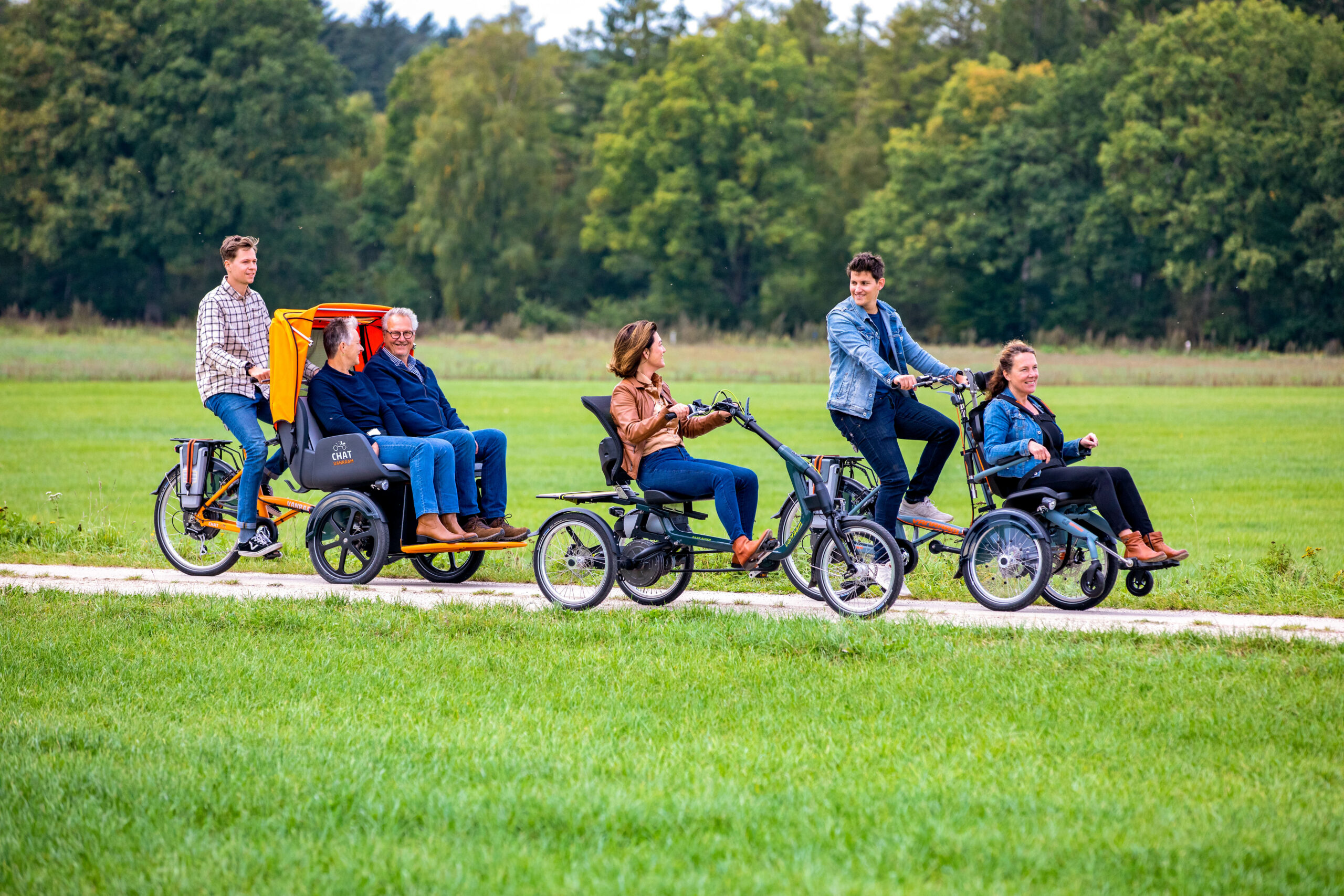 Wanneer alleen fietsen niet meer gaat maar je nog wel graag fietstochtjes wilt maken dan kan dat met één van de Van Raam tandems of de Fun2Go duofiets. Van Raam heeft verschillende tandems, zowel met twee als drie wielen en zowel ouder/begeleider-kind tandems als tandems voor twee volwassenen. Op Fun2Go duofiets zit je naast elkaar, waarbij één persoon stuurt en beide personen kunnen trappen. Doordat je naast elkaar zit, kun je goed met elkaar communiceren tijdens het fietsen. Zo is fietsen naast gezond ook nog eens erg gezellig!